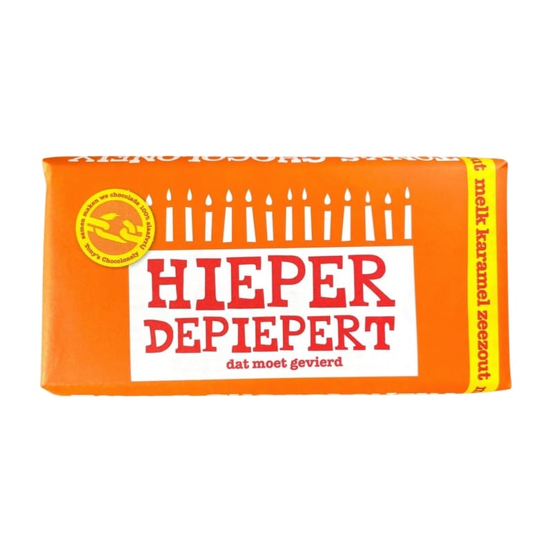Overheerlijke reep Tony Chocolonely in een wikkel met de tekst ‘Hieperdepieper’.