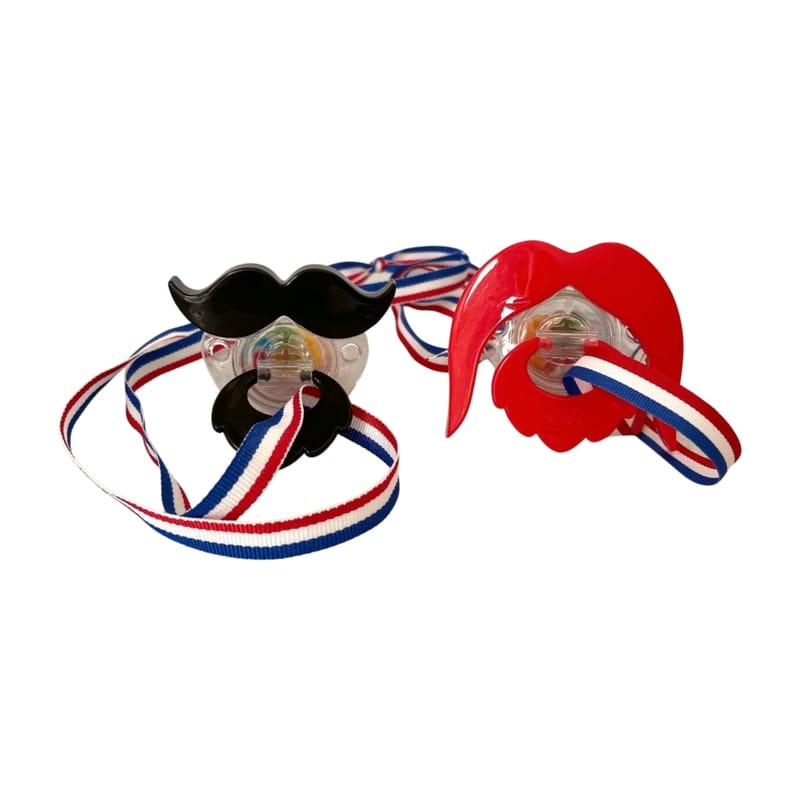 Elke snor-lollie wordt geleverd met een gekleurd lint, zodat je hem als een medaille om je nek kunt dragen.