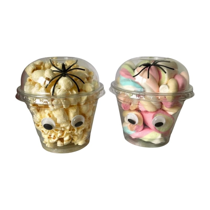 Je ontvangt een losse beker, losse spinnen en losse oogjes. Even de oogjes erop plakken, de bekers vullen en klaar.