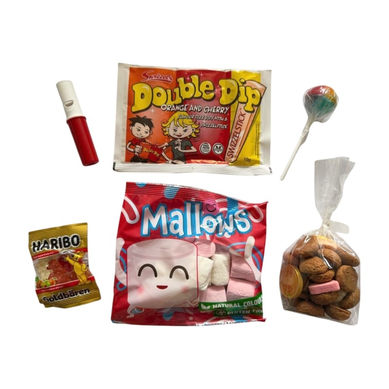 In het tasje vind je een leuke en gevarieerde mix van zoetigheden, geschikt voor jong en oud: