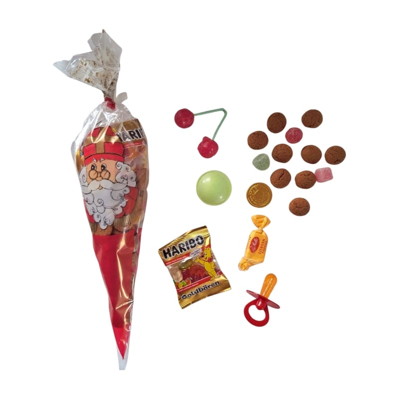 Snoepzak met de opdruk van Sinterklaas, gevuld met een mix van pepernoten en snoepjes.