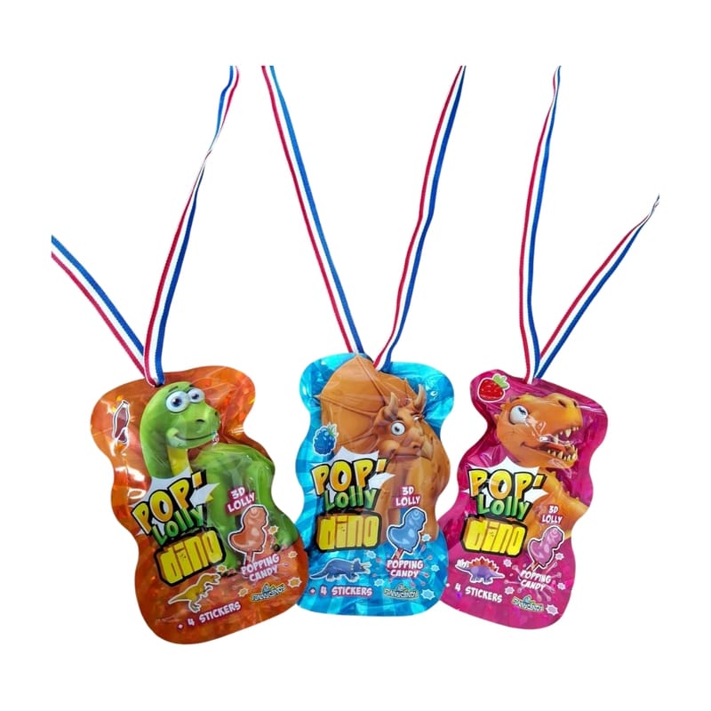Dino Traktatie aan Lint- Stoer zakje met 3D dinosauruslollie, knetterdip en stickers – met lint om te dragen