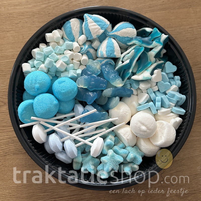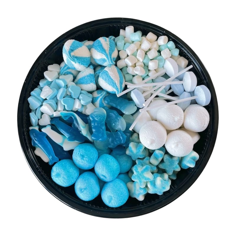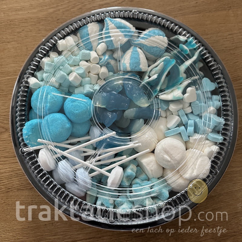 Snoepschaal gevuld met heerlijk blauw en wit snoep.