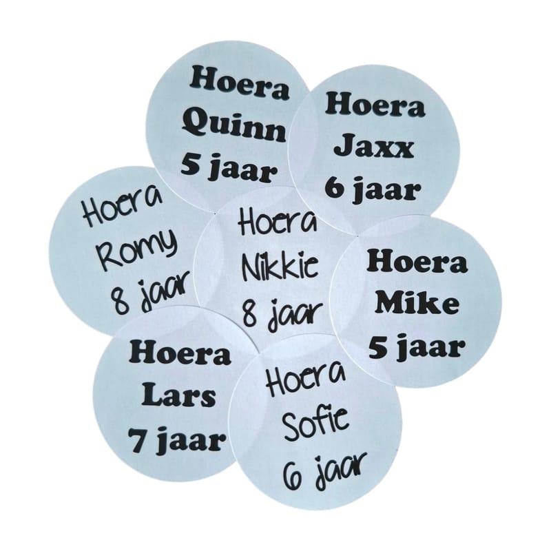 Papieren stickers met eigen naam en leeftijd, je mag de naam en de leeftijd vermelden tijdens het bestellen bij de bestelnotities.